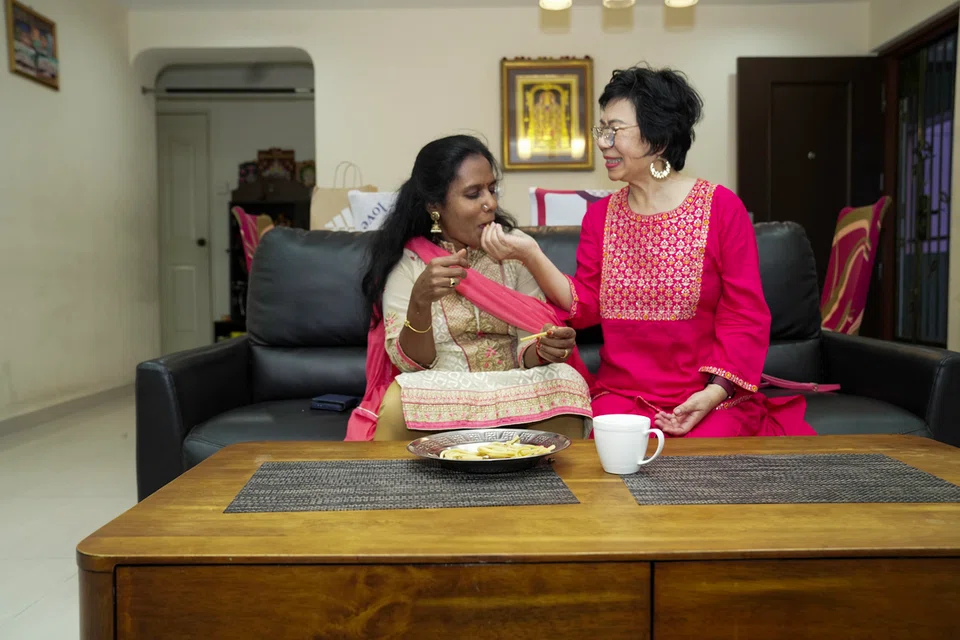 A volunteer with the Palm View Residents’ Network, Mdm Jessie invited Mdm Vijayalakshmi to a Deepavali celebration last year. That event created an even stronger bond between them when she asked Mdm Vijayalakshmi for help tying a saree.