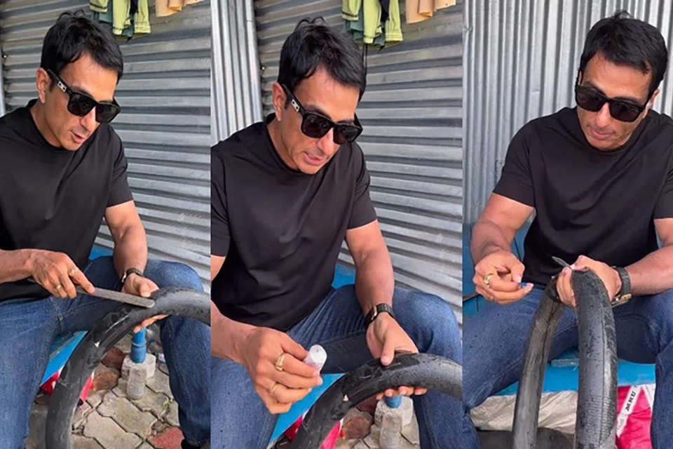 Actor-philanthropist Sonu Sood shares a video of him doing repair work at Mohd Anwar’s cycle shop in Hyderabad.