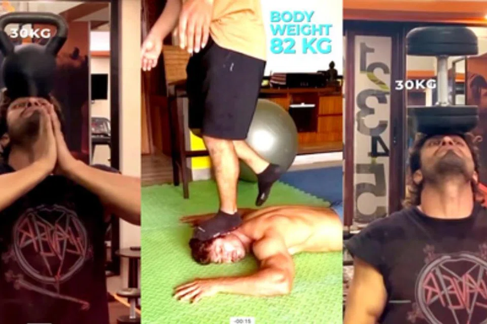 He shared a video in which he is seen balancing a 30kg kettlebell and dumbbell on his forehead, and letting an 82kg man stand on his head as he lies on a gym mat.