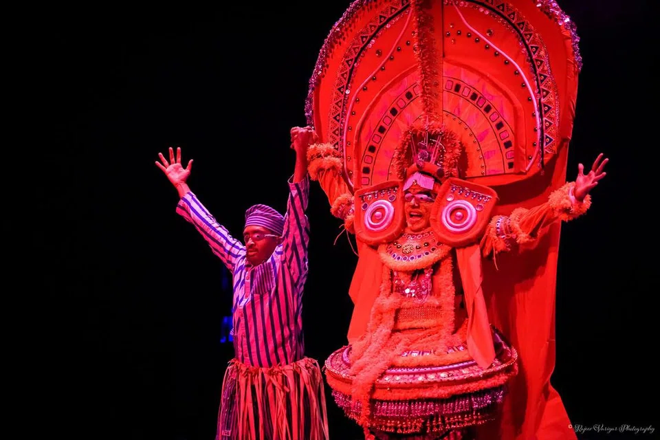 Adding a distinctive cultural layer, the play weaves in the ritualistic presence of Shastappan Theyyam, symbolising Madhavan’s conscience. Shastappan Theyyam is a powerful and significant ritual art form performed in the northern parts of Kerala.