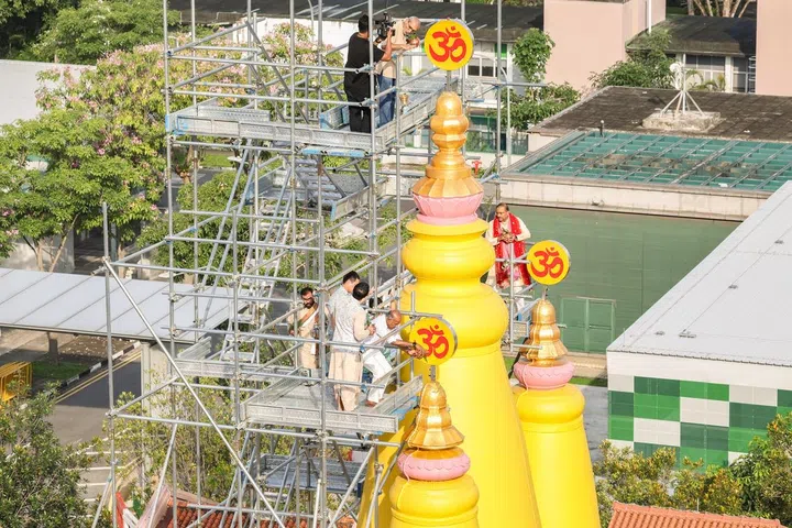 Minister K. Shanmugam, SLNT president Prof Balram Chowbay, and retired Colonel Perdit Tiwari pouring holy water over the temple’s sacred spires or shikharas on Feb 25.