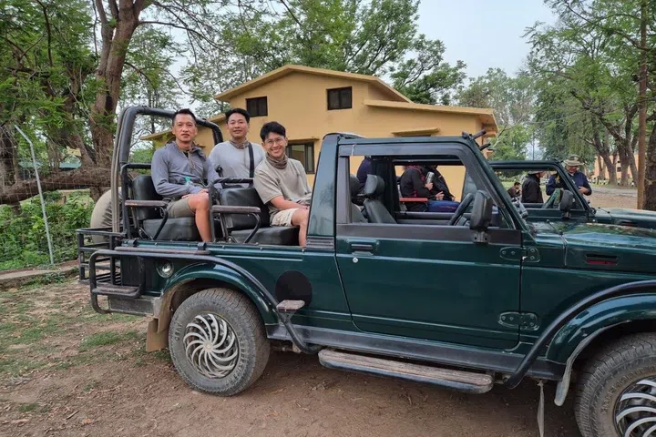Mr Khoo Yu (right) with his friends at the Jim Corbett National Park;  (below) spotting the elusive Bengal tiger and in front of the Hawa Mahal in Jaipur.