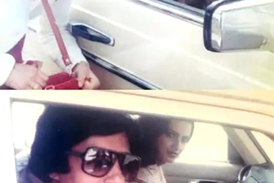 Believed to be from its Kashmir shoot, the image shows Amitabh behind the wheel of a vintage car with Rekha beside him.