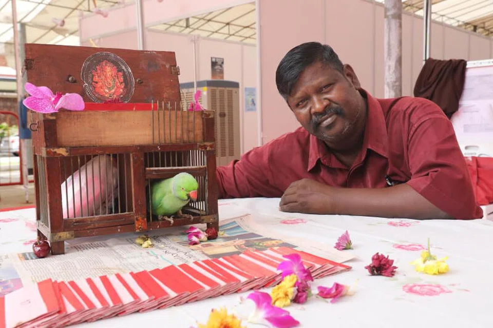 Parrot astrology is a rare sight these days, and part-time astrologer Selvaraju Muniyandi, 53, had been called in as a special segment of the festival. Lovingly urging Letchumi – his sidekick for the last 20 years – out of her cage, he politely asked her to pick, using her orange beak, a fortune card from a deck of 27.