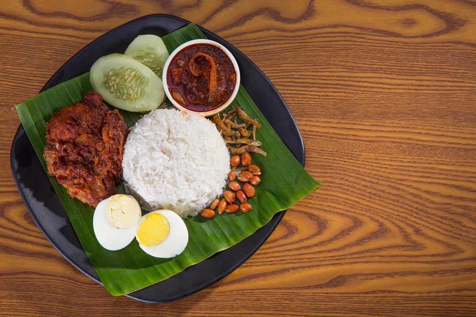 Another all-day breakfast item is nasi lemak – a fragrant rice dish cooked in coconut milk and pandan leaves, accompanied by fried anchovies, crunchy peanuts, cucumber and sweet sambal chilli paste.