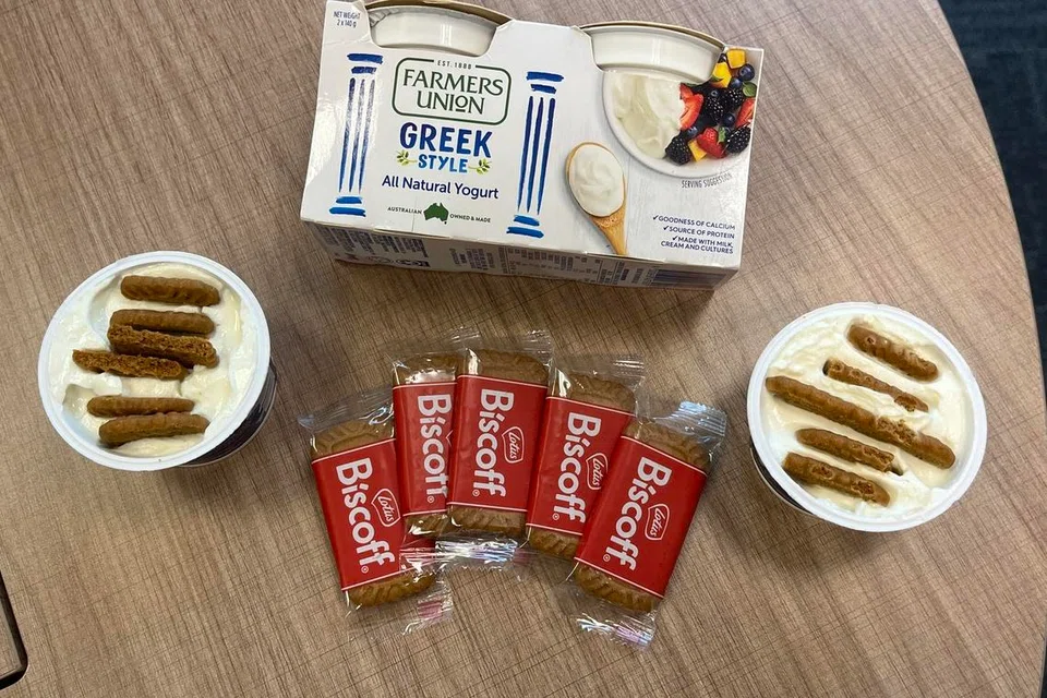 My personal recommendation is the plain Greek-style yoghurt and Biscoff cookies, but with an added drizzle of honey or a spoonful of cookie butter to amplify the “cheesecake” flavour.