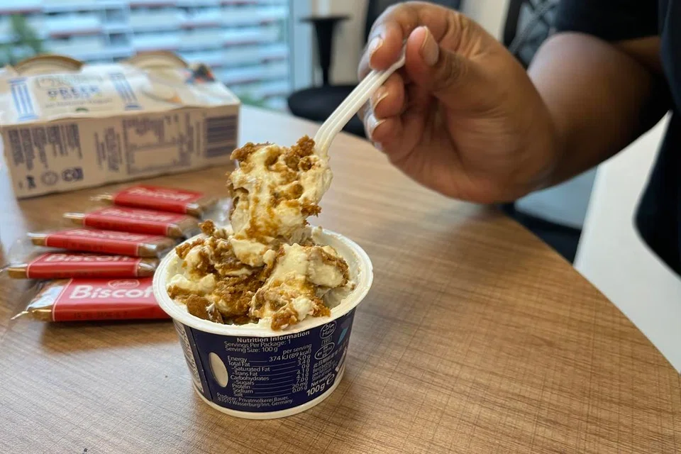 The ideal serving size for one person would be about 100 to 150 grams. The ratio of yoghurt to Biscoff cookies depends on your preferred level of sweetness. In its own experiments, the tabla! team found that the sweet spot was three cookies per 100 grams of yoghurt.