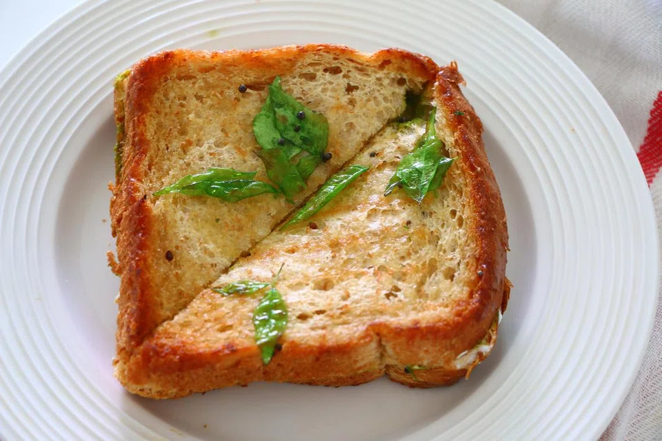 4 slices of bread 2 tsp green chutney 2 tbsp hung yogurt or hung curd (put in a tea strainer for 15 minutes) 4 tsp oil 1 tsp mustard seeds A few curry leaves