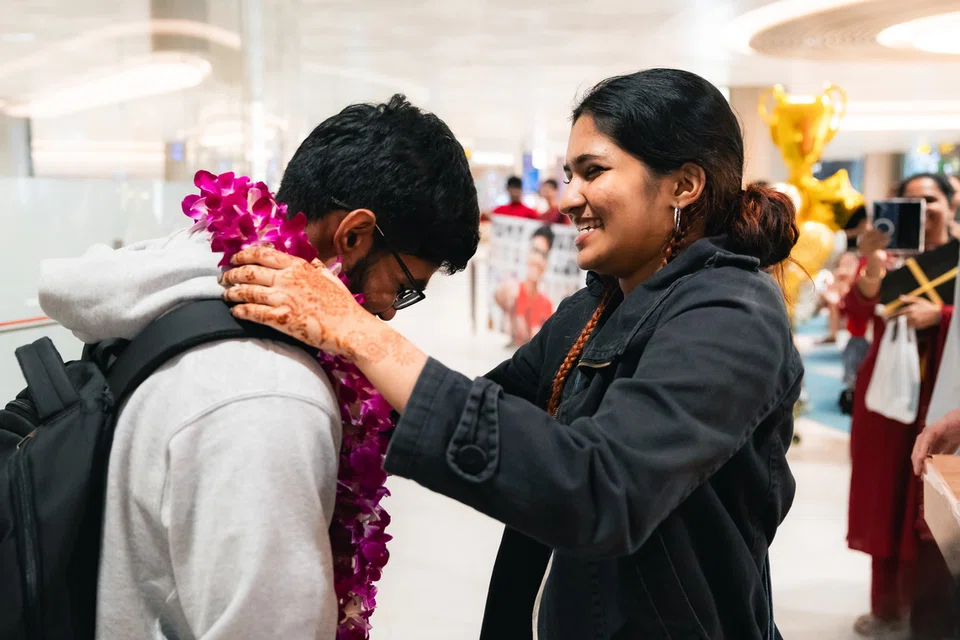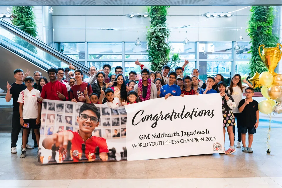 Following his victory in the Under-18 category of the World Youth Chess Championships, Siddharth Jagadeesh, 18, returned home to an elated reception by his family and friends, as well as members of the Singapore Chess Federation, at Changi Airport on Oct 16. He was also garlanded with an orchid lei by his sister, Tarini Jagadeesh, 17, at the arrival hall.