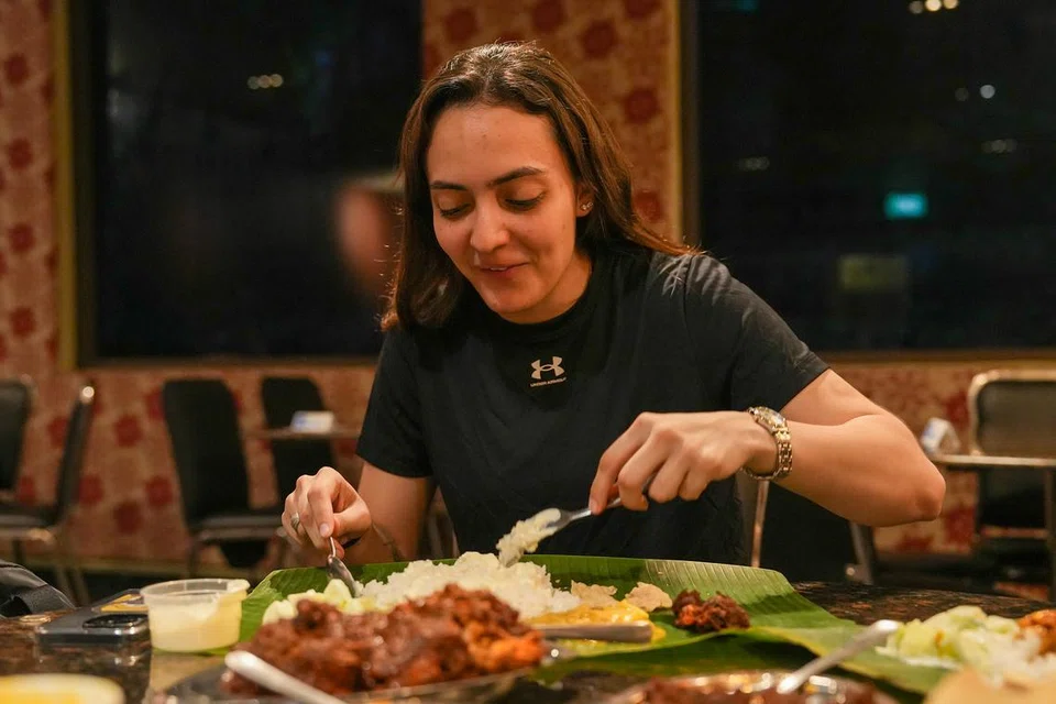 When the food arrives, the left-handed Singapore fencer duly scoops a few dollops of yogurt onto her banana-leaf bed of rice – almost as if it’s the only way she enjoys South Indian fare – revealing a tattoo of Olympic rings inked on her forearm.