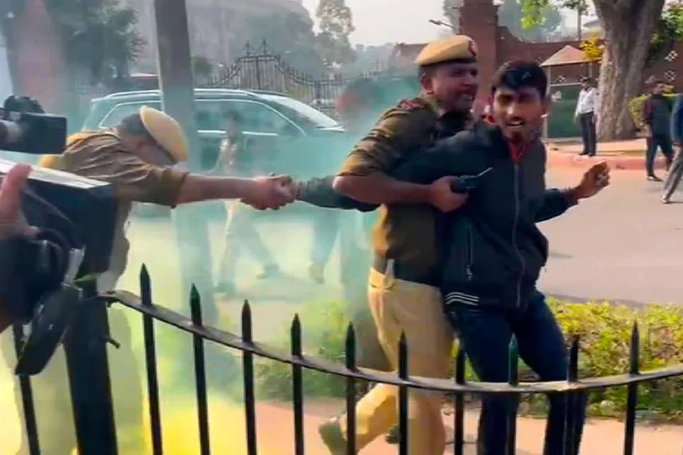 Outside Parliament, Neelam Azad and Amol Shinde used canisters with yellow and red smoke and shouted slogans against “dictatorship”.