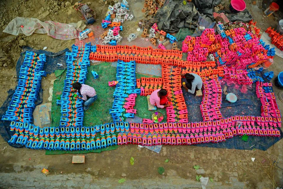 Potters paint traditional earthen oil lamps ahead of the festival of Deepavali in Jalandhar, Punjab, on Wednesday.