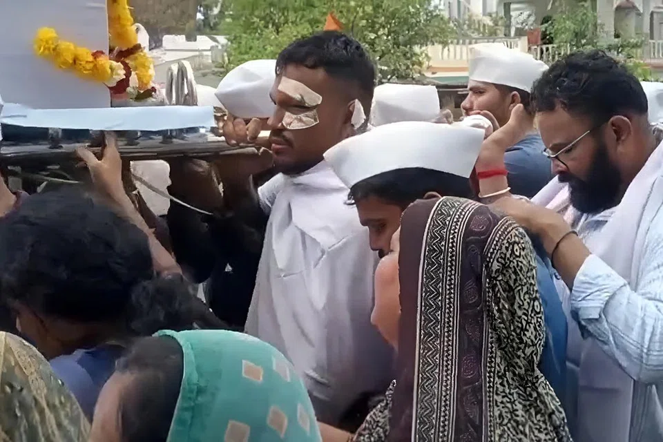 Dressed in a simple white cloth and blue jeans, he stumbled repeatedly under the combined weight of physical wounds and unbearable sorrow, supported by family and villagers who had gathered to pay their final respects to Mr Ajay, his brother and fellow passenger on the doomed flight.