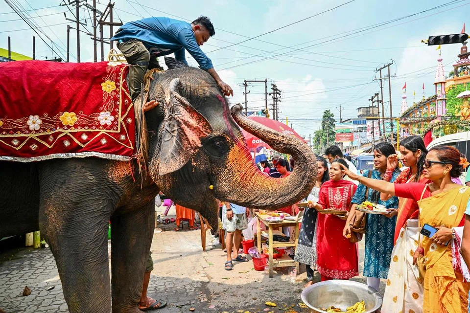 Devotees offer food to an elephant as they arrive to pray at a Lord Ganesha temple in Guwahati, Assam, on Aug 27.