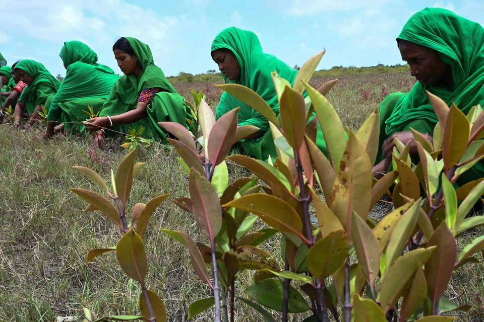 Women from the Green Brigade volunteer group planting saplings by a riverside in Dakshin Durgapur village, about 140km from Kolkata, on Wednesday on International Day for the Conservation of the Mangrove Ecosystem.