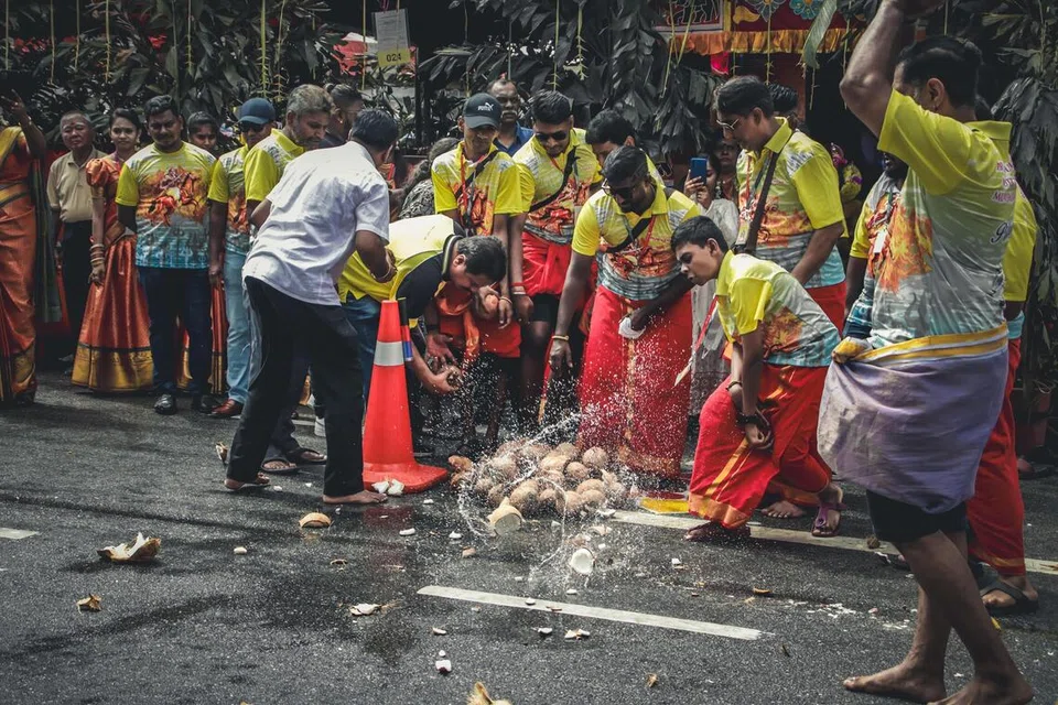 On the eve of the Hindu festival, which was held on Jan 25 in Malaysia like in Singapore, hundreds of booths serving free food and drinks, including heaps of coconuts, line the sides of the road.