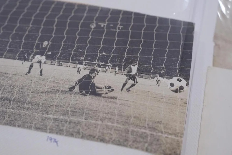 “Ahh, here – the goal I scored against China,” he says, sitting up excitedly while pointing to a polaroid photo in black and white.