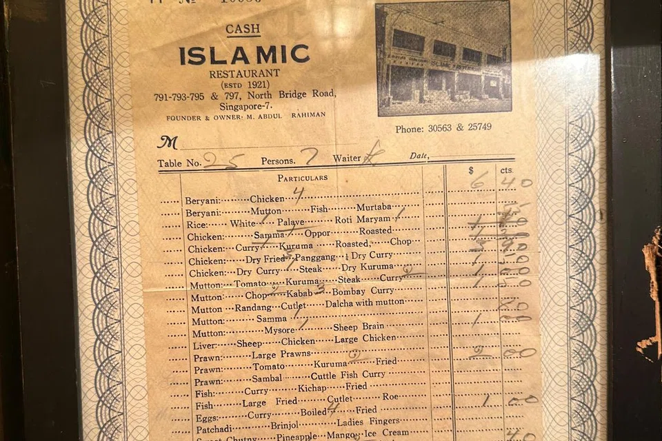 Mr Kalil furrowed his brow when I told him of the unique and rare combination of duck and biryani found at Bama’s Kitchen. He then points to a receipt on the wall from 1962, that shows “duck” on the menu.
