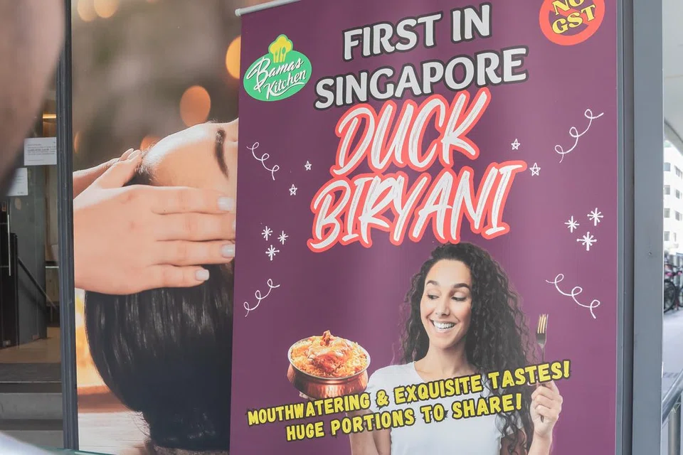 The pink life-sized banner belonging to Bama’s Kitchen outside the Trio shopping mall in Sam Leong Road on the outskirts of Little India grabs your attention from metres away. On it is the striking bold claim: “First in Singapore: Duck Biryani”.