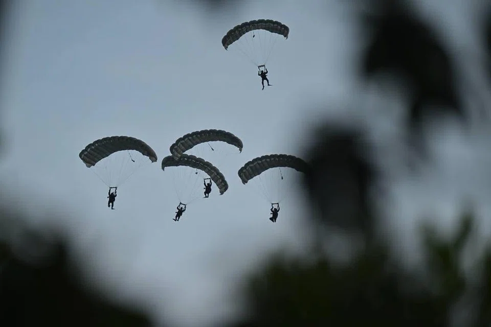 The Red Lions’ arrival was just half of the perennial crowd favourite. In the inaugural Jump of Unity at the 2025 parade, seven naval divers parachuted into Marina Bay from a helicopter at about 1,830m above ground.