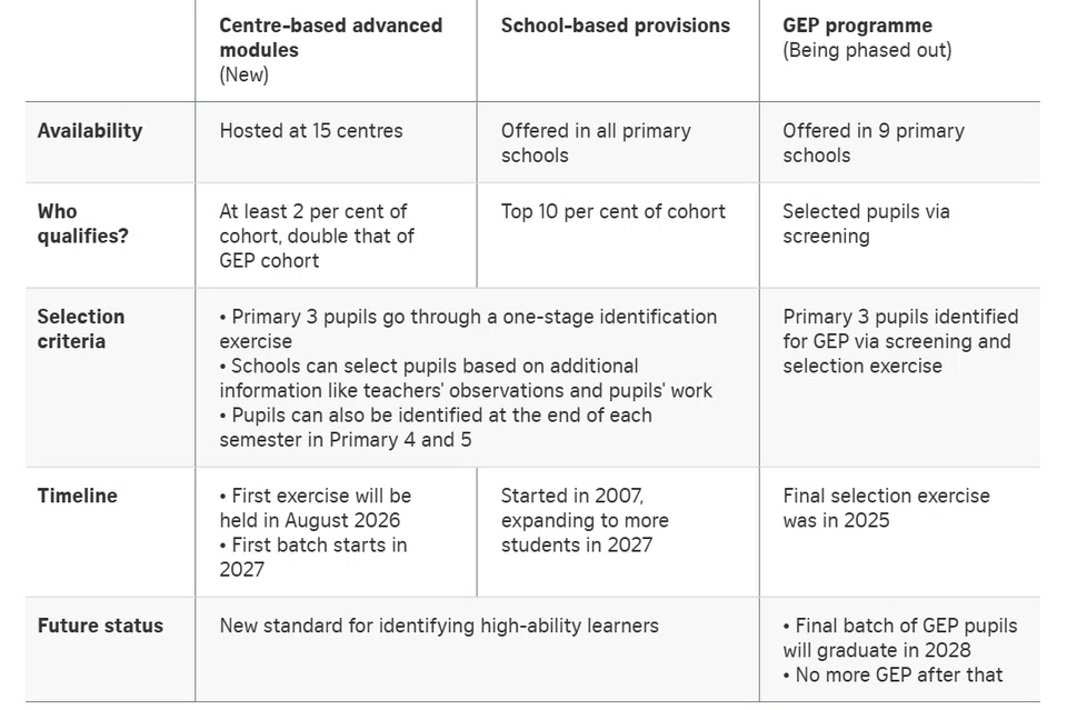 Together, these school-based provisions and centre-based advanced modules will replace the GEP – whose last batch will be the Primary 6 cohort in 2028 – as the new standard of support for pupils with academic strengths and talents.